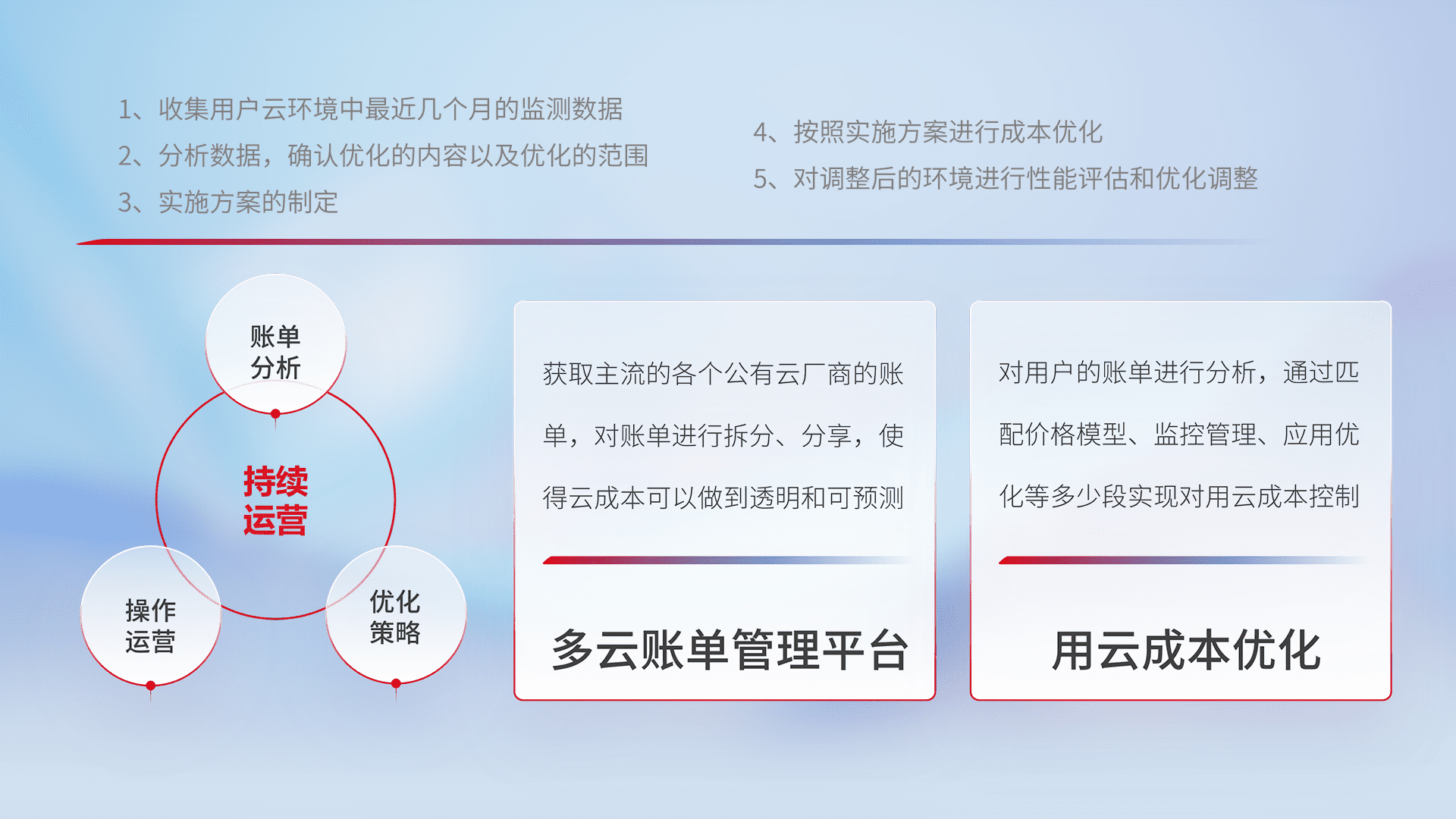 通过多云纳管,,,以统一的资源数据模型把客户的云资源进行抽象和封装,,进而实现对多云资源的统一操作,,,保障云资源管理的可靠性、、、稳定性与可用性。。。量身定制化运维内容,,,配置、、、开发运维、、、、补丁管理、、备份、、监控、、认证和访问管理、、、审计和日常巡检等,,,保障在用云过程中的可靠度,,,稳定度以及高可用率。。。。