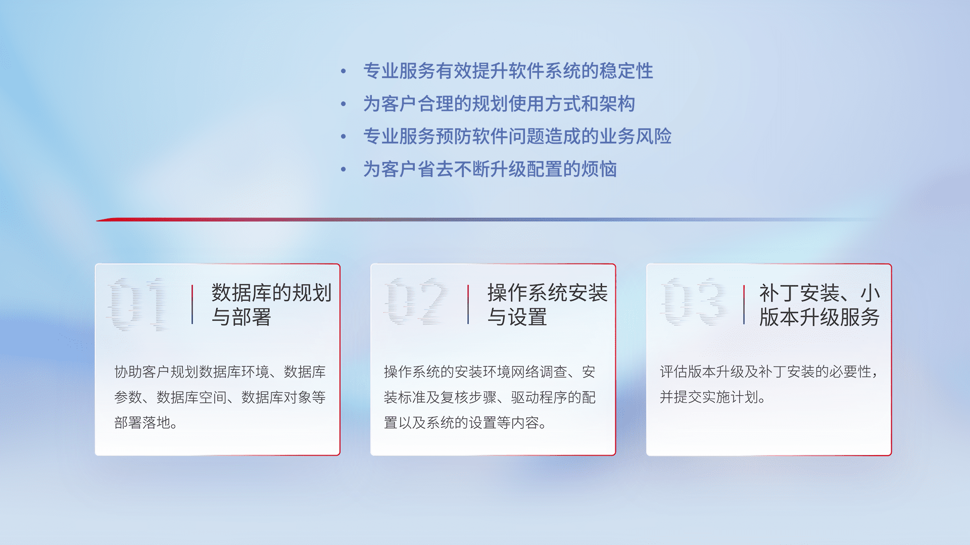 为客户提供软件规模升级、、快速部署、、、按需配置的专业服务,,,从数据库的规划与部署到操作系统的安装与设置,,,再到补丁安装和小版本升级提供支持。。